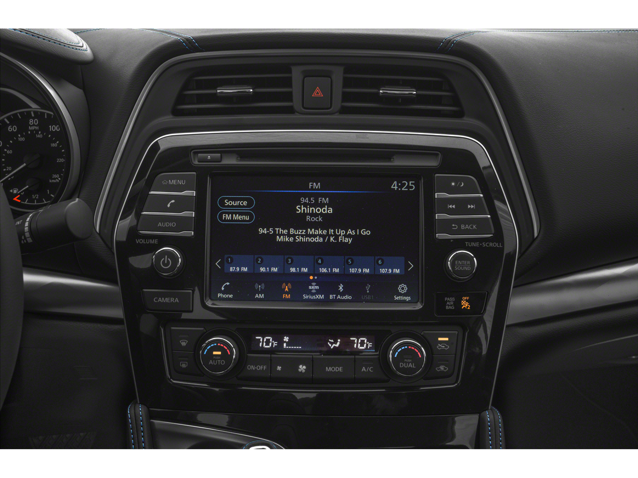 - Radio: AM/FM/CD Audio System w/Navigation -inc: MP3/WMA reader, NissanConnect w/navigation featuring Apple CarPlay and Android Auto, 8" color display w/multi-touch control, 2 front illuminated USB connection ports (1 Type-A, 1 Type-C) for iPod interface and other compatible devices, Bluetooth hands-free phone system, streaming audio via Bluetooth, hands-free text messaging assistant, SiriusXM satellite w/advanced audio features, auxiliary audio input jack, Nissan door to door navigation w/3D building graphics and satellite imagery, connected navigation features including online POI search, door-to-door navigation, and online premium traffic information, HD radio, SiriusXM Travel Link (weather, fuel prices, movie listings, stock info, sports and parking), SiriusXM Traffic, 11 speaker Bose sound system and 2 rear illuminated USB charge ports (1 Type-A, 1 Type-C)